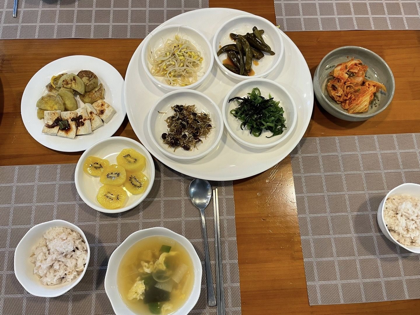 2. 리뷰에도 많았던 조식!👍🏻 진짜 맛있고 만족스러웠어요! 사모님이 직접 정성들여 손수차려주시고, 반찬등도 직접 기르신것들을 재료로 쓰셔서 퀄리티가 굉장히 좋았습니다!