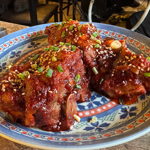 목살이 매우 부드럽고 소스도 맛있다. 뼈갈비는 양념이 매우 진해서 짠 편이다. 2시간내로 먹어야 해서 편하게 먹기엔 비추.