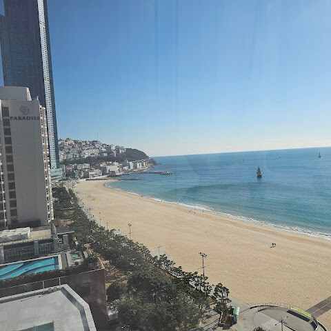 위치도 환상적입니다. 호텔 바로 옆에 있어 해운대 해수욕장까지 2분이면 갈 수 있어요. 호텔 뒤편에는 수백 개의 레스토랑, 바, 상점들이 있어서 즐길 거리가 정말 많아요. 불평할 게 하나도 없죠. 참고로, 부산에는 멋진 바들이 정말 많아요.