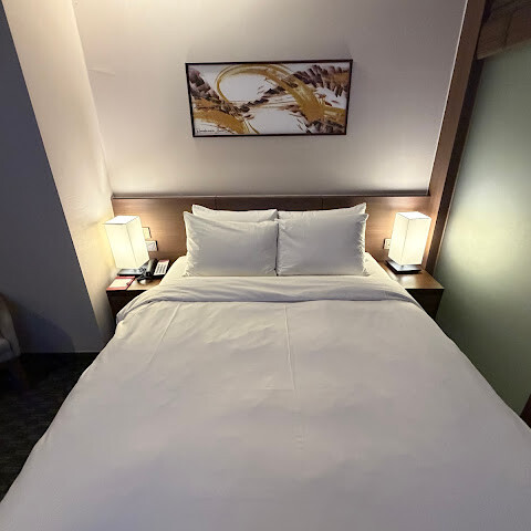 객실은 넓었고, 냉장고, TV, 주전자, 헤어드라이어, 편안하고 단단한 침대가 있었고, 욕실에는 워크인 샤워실과 일본식 변기가 있었습니다.