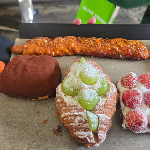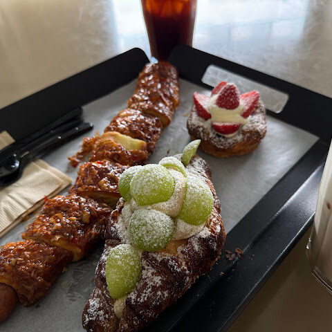 크루아상은 맛있었어요. 저는 포도맛 크루아상을 주문했는데, 개인적으로는 마음에 들었어요. 어머니께서는 오리지널 크루아상을 주문하셨는데, 정말 좋아하셔서 지금까지 먹어본 크루아상 중 최고라고 하셨어요. 음료는 바닐라빈 라떼와 딸기 밀크티를 주문했어요. 다른 분이 바닐라빈 라떼를 추천해 줬는데, 어머니께서 달다고 하셨어요. 단맛이 싫으시면 주문하지 마세요. 딸기 밀크티도 정말 달콤했어요! (저는) 2층과 1층이 나뉘어 있어서 자리는 쉽게 찾을 수 있었어요. 하지만 음식을 받기 전에 미리 자리를 예약하는 걸 추천해요. 계산 후 디저트와 빵에 대한 안내 표지판이 있어서, 계산이 끝날 때까지 기다렸다가 받아갈 수 있어요. 아주 편리하고, 1층에 휴대폰 충전할 수 있는 공간도 있어서 더 좋아요. 두 명이 총 27,000원이었어요. 참고하시라고요~