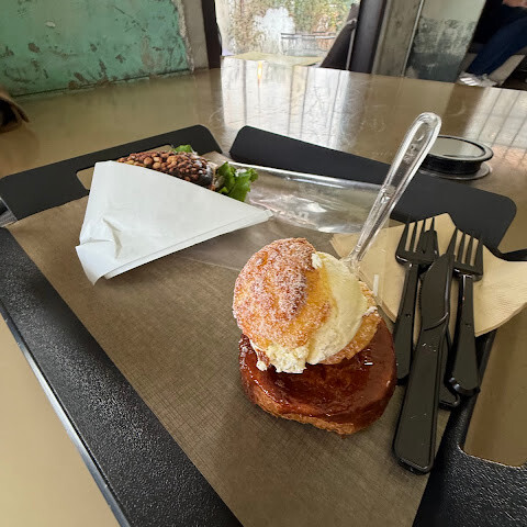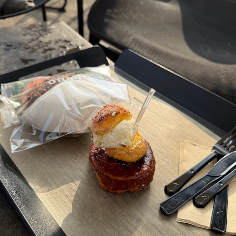 캐러멜라이즈드 브리오슈 베이스에 신선한 수제 아이스크림을 얹은 슈크림 퍼프입니다. 달콤함과 짭짤함이 독특하게 어우러져 바스크 치즈케이크를 떠올리게 했습니다. 정말 맛있습니다.