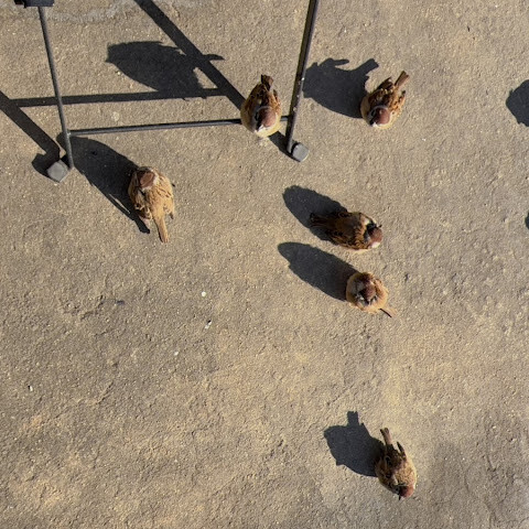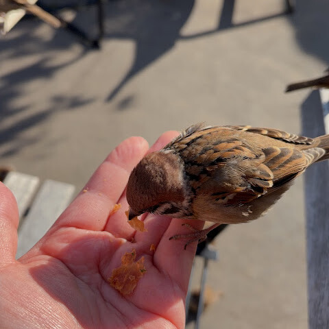 동행자는 새가 약하기 때문에 트레이를 잡은 채 서서 먹고 있었지만, 나는 손에서 빵을 먹을 정도로 그리운 참새가 귀엽고 치유되었습니다.