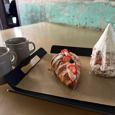 카페 어니언의 대표 디저트는 겉은 바삭하고 속은 부드러운 '판도라 브레드'입니다. 슈가파우더가 뿌려져 달콤하지만 과하지 않은 맛으로 많은 사랑을 받고 있습니다. 매일 갓 구워내는 빵과 깔끔하고 심플한 커피는 완벽한 조합을 이룹니다. 매장의 강렬한 디자인 감각 덕분에 산업적인 분위기와 한옥 스타일 모두 인스타그램 사진 명소로 인기를 얻고 있습니다.