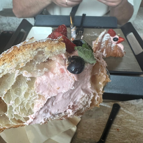 분위기는 좋았고, 커피는 괜찮았고, 페이스트리는 별로였어요. 맛보다 보기에 예뻤을 뿐이에요.