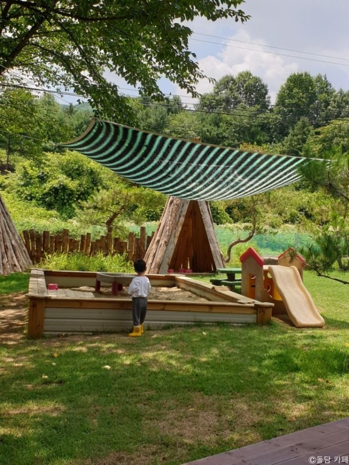 용인시 처인구 한적한 동네에 있는 넓은 카페이다. 넓은 잔디밭과 모래 놀이터, 계곡을 함께 즐길 수 있다. 마치 캠핑장에 온 것처럼 어린이들과 신나게 뛰어놀며 하루를 보낼 수 있다. 카페 건물이 넓지는 않으나 외부 공간이 넓어 한적한 시골 동네에서 자연과 하나 되어 가족끼리 함께 놀 수 있는 곳을 찾고 있는 분들이 좋아할 만한 공간이다. 특별한 것을 하지 않고도 자연과 어울려 쉰다는 것만으로도 힐링이 될 수 있다.