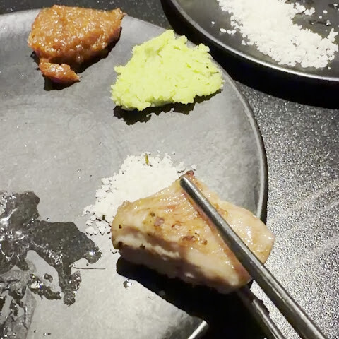 츠케다레는, 소금·와사비·삼장, 가게가 우선은 소금으로 먹어라라고 들었으므로 소금으로 먹으면 엄청 맛있었습니다♪