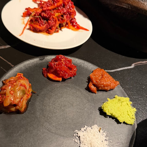 와, 서빙 시작하자마자 왜 여기가 그렇게 인기가 많은지 알았어요. 부드러운 돼지고기에 소금에 절인 조개와 와사비가라니? 생각지도 못했는데 둘이 정말 잘 어울렸어요. 고기가 너무 부드러워서 씹지도 않고 녹아내리는 것 같았어요. 김치찌개를 비롯한 여러 김치도 정말 맛있었어요.