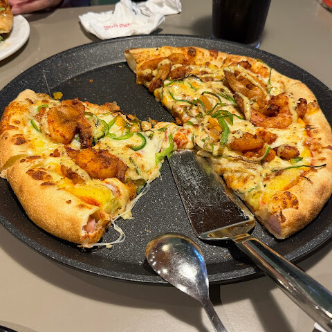 피자는 정말 맛있었고, 특히 치즈와 핫도그가 반반씩 들어간 크러스트를 고른 게 아주 마음에 들었어요! 음료도 양이 꽤 많았고요! 식사 시간이 아닌데도 불구하고 사람이 정말 많았어요.