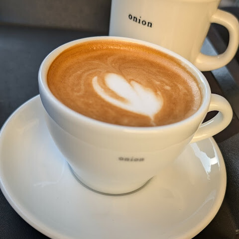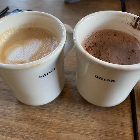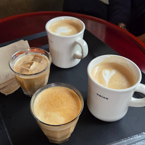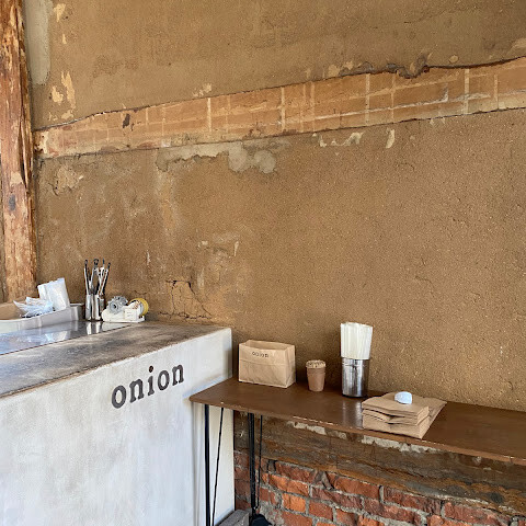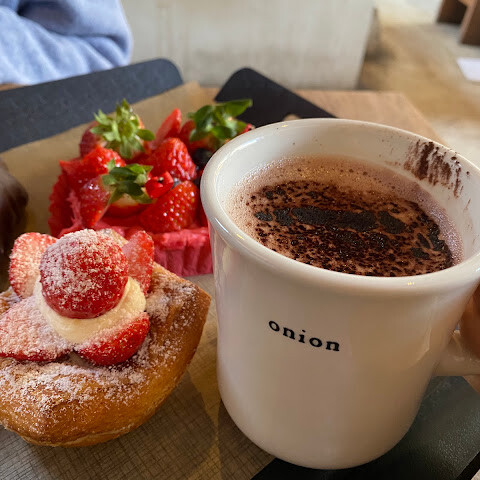 디저트와 아메리카노 1잔, 라떼 2잔, 카푸치노 1잔, 차 1잔을 주문했습니다. 디저트로는 딸기 타르트를 골랐습니다. 딸기 브라우니는 초콜릿 맛이 나지 않고 당근 케이크에 가까웠습니다. 어니언 시그니처 케이크는 슈가파우더가 엄청나게 뿌려져 있었고, 케이크 자체는 파운드 케이크 같은 식감이었습니다. 전체적으로 너무 달지는 않았지만, 슈가파우더에 목이 막히지 않도록 조심해야 합니다. 피스타치오 페이스트리는 꽤 괜찮았습니다. 겉은 바삭했지만, 필링이 고르게 분포되어 있지 않아 반쯤 먹고 나서야 맛을 느낄 수 있었습니다. 우리 모두의 의견에 따라 가장 맛있었던 디저트는 겉보기에는 평범해 보이는 치즈케이크였습니다. 짭짤하면서도 달콤한 맛이 조화롭게 어우러졌고, 치즈 맛이 너무 강하지 않아서 좋았습니다.