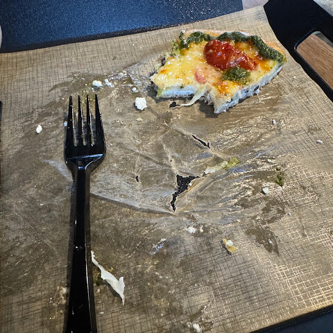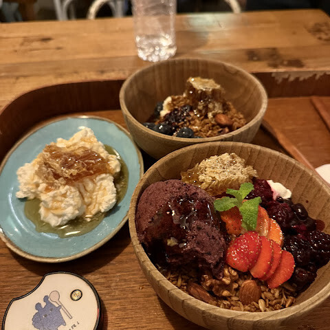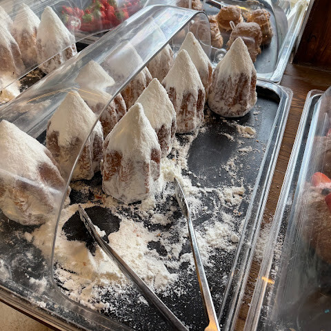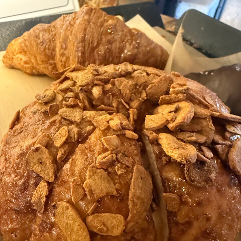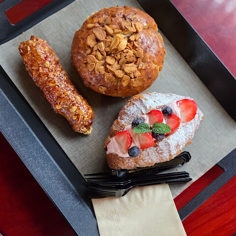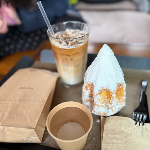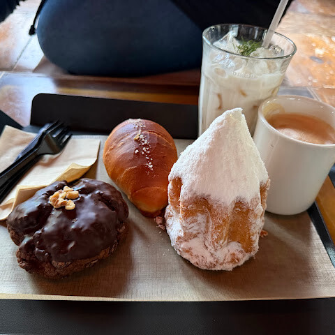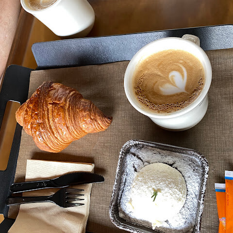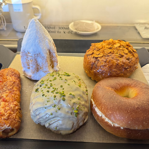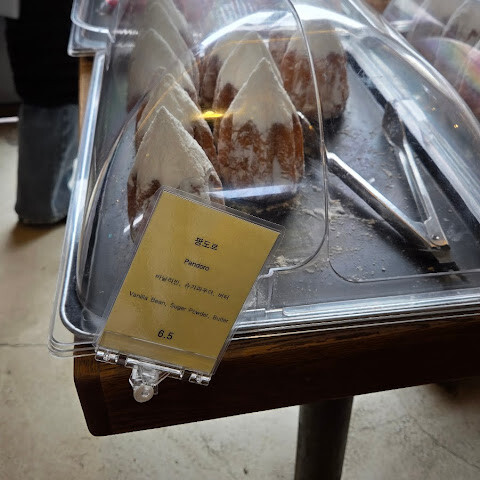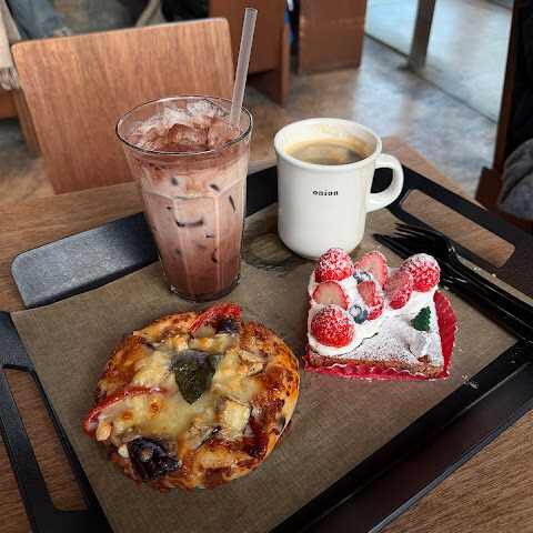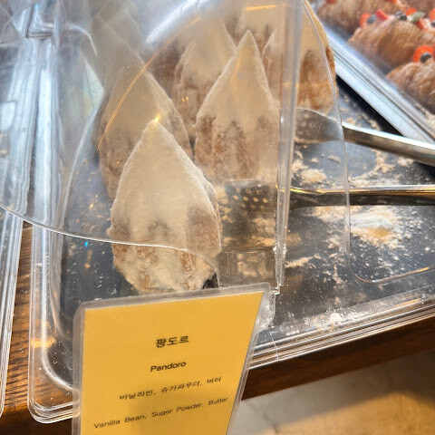 평일 아침 일찍이라 줄도 없고 자리도 넉넉했습니다. 커피는 은은한 캐러멜 향이 나면서도 진해서 좋았습니다. 아침 식사 중 가장 만족스러웠습니다. 메뉴는 대부분 단 음식이었고, 짭짤한 음식은 거의 없었습니다. 그나마 있던 올리브 피자 브레드는 기름기가 너무 많아 다 먹지 못했습니다. 단 음식을 좋아한다면 선택의 폭이 넓겠지만, 저로서는 다시 방문하고 싶을 만큼 짭짤한 메뉴가 부족했습니다.
