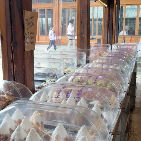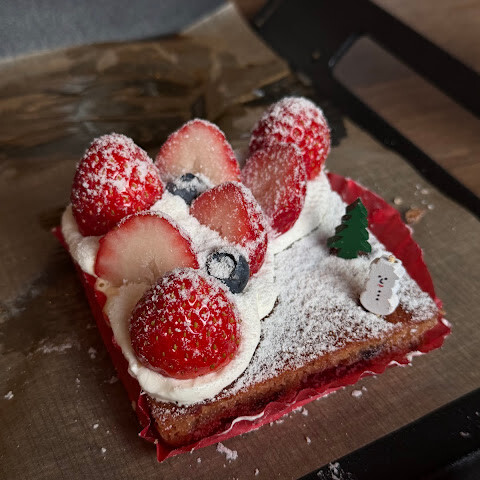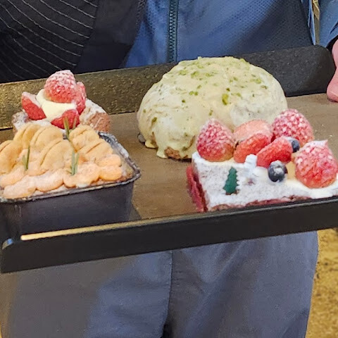다양한 페이스트리, 케이크, 빵이 준비되어 있지만, 저희는 눈송이 장식이 올라간 케이크를 특히 좋아했습니다.