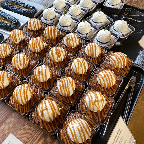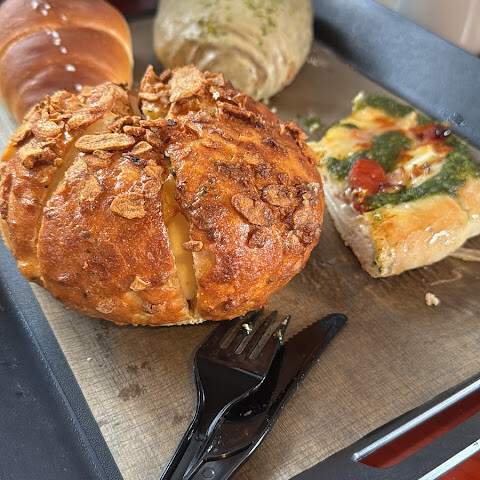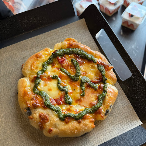 다양한 종류의 빵이 준비되어 있어 선택의 폭이 넓습니다. 저희가 먹어본 빵은 겉은 바삭하고 속은 부드럽고 살짝 쫄깃했습니다. 크리미한 소스가 듬뿍 올려져 있었고, 말차 가루가 살짝 뿌려져 있어 은은한 쓴맛이 풍부한 맛과 조화를 이루었습니다.