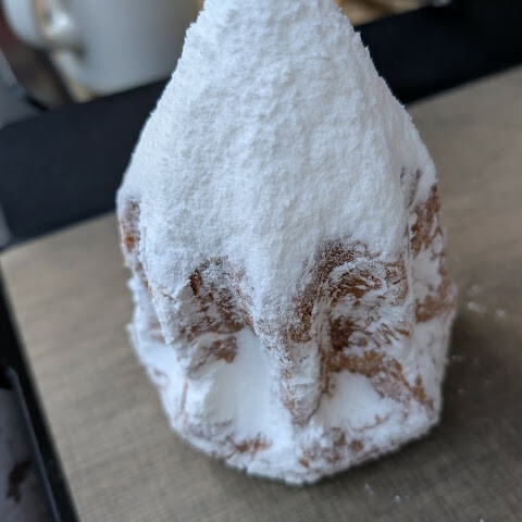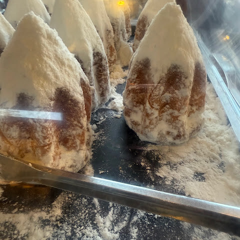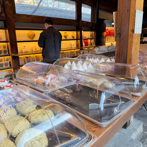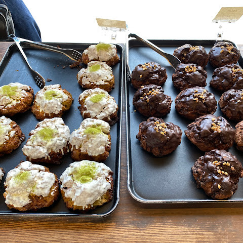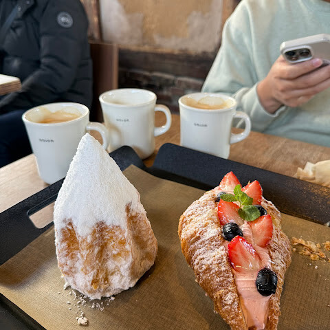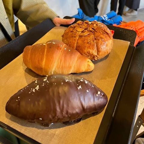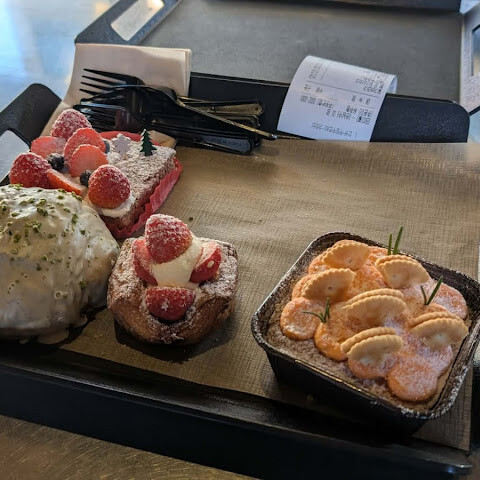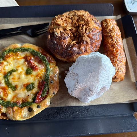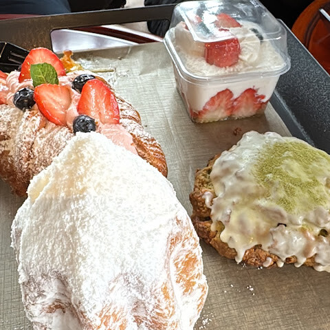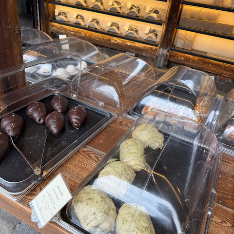 이곳의 빵 선택은 매우 광범위합니다. 우리가 먹어본 빵은 겉은 바삭바삭하고 속은 부드럽고 쫄깃하며, 그 위에는 풍부한 크림과 말차 가루가 뿌려져 있었습니다. 약간의 쓴맛이 전체적인 단맛과 완벽하게 균형을 이루었습니다.