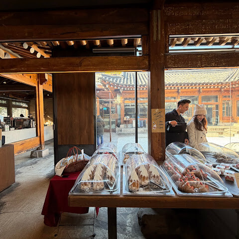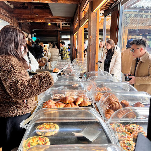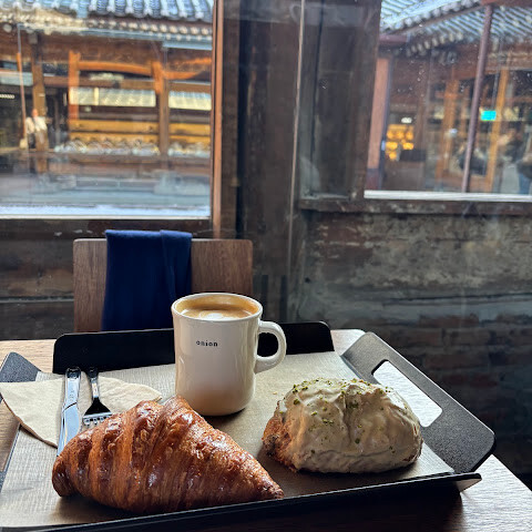 카페 어니언 앙국에 갔는데 운 좋게도 오후 1시쯤 도착해서 줄을 서지 않고 바로 들어갈 수 있었어요. 빵 종류도 정말 다양하더라고요. 빵 맛이 최고는 아니었지만, 한옥 분위기가 정말 좋았어요.