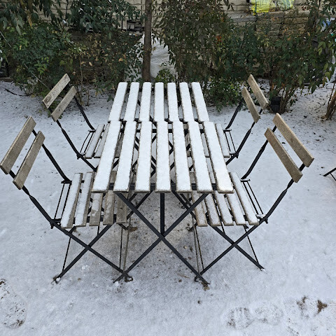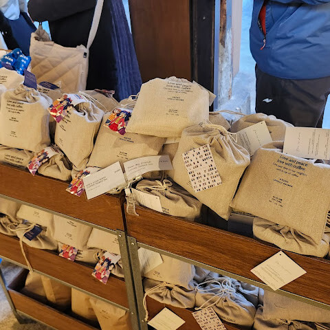 정말 아름다운 카페네요! 현대적인 카페 인테리어와 오래된 내부 좌석이 멋진 조화를 이루고 있어요. 밤새 눈이 내렸는데, 덕분에 카페가 더욱 마법 같은 분위기를 자아냈어요.