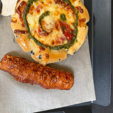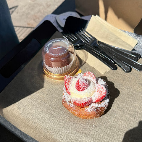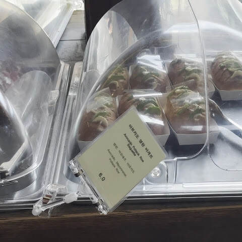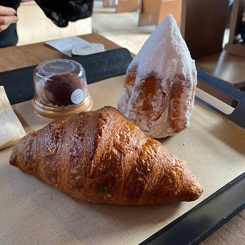 앉아서 먹으려면 꽤 오래 기다려야 해요.<br>테이크아웃도 계산대가 하나밖에 안 열려 있어서 줄이 엄청 길었어요.<br>하지만 특제 메뉴는 제 취향은 아니었어요. 좀 심심했거든요. 콘 모양의 페이스트리였는데, 말차를 좋아한다면 말차 스콘은 괜찮을 거예요.<br>갈릭 크림치즈 번은 맛있었어요. 딸기 페이스트리는 그냥 그랬어요.