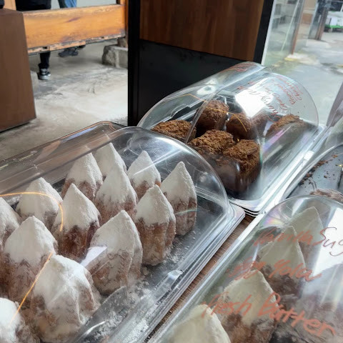 비 오는 주말 오전 중반에 갔을 때는 정말 붐볐지만, 훨씬 빨리 들어갈 수 있는 야외 좌석이 있어서 20명이 넘는 줄을 완전히 피할 수 있었습니다. 소금빵, 말차 스콘, 카푸치노를 먹어봤는데 모두 훌륭했습니다!