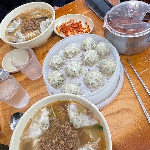 지금까지 제가 가장 좋아하는 곳 중 하나예요. 기다리는 동안 키오스크에서 주문해야 해요 (말씀하시는 건 아니고, 그냥 손님이 알고 있다고 생각하는 것 같아요). 그리고 자리에 앉으면 티켓을 직원에게 건네주면 돼요. 칼국수는 그냥 사골 육수만 먹는 것보다 훨씬 맛있어요. 비빔면 소스도 맛있고 만두도 맛있어요. 김치는 지금까지 먹어본 김치 중 가장 매웠지만 정말 맛있었어요. 줄이 길고 빨리 줄어요. 브레이크 타임에 가까워지면 주문을 받지만 (당연히) 그 시간에는 주문을 받지 않아요.