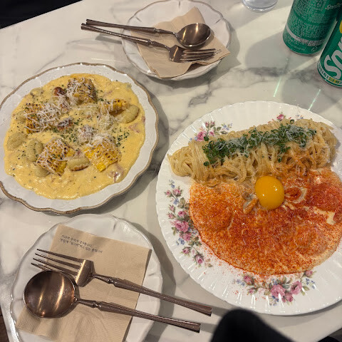 성수다락에서 매콤한 크림 파스타와 옥수수 뇨키를 시켰는데 정말 맛있었어요! 독특한 맛에 순식간에 다 먹어버렸네요. 이탈리아와 한국이 절묘하게 어우러진 요리였어요. 2층으로 된 좌석이 있어서 기다릴 필요 없이 바로 앉을 수 있었어요. 강력 추천합니다!