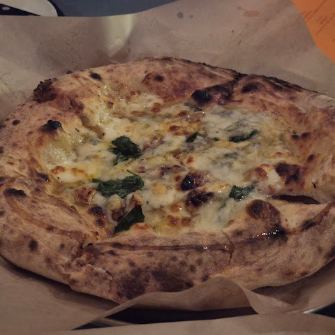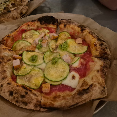 피자 평점이 좋아서 먹어보려고 왔어요. 애호박과 고르곤졸라는 정말 맛있었고, 브로콜리니도 괜찮았어요. 빵 맛도 정말 좋았어요. 피자는 꽤 작은 편이라 (개인용 사이즈) 여러 명이서 나눠 먹어야 할 수도 있어요. 꽤 바빠서 대기 시간이 한 시간 정도 걸렸어요. 테이블이 준비되면 알려주는 한국 전화번호가 없어서 서버에게 미리 예약해야 했어요.