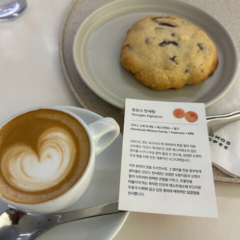 ☕️이 지점의 특별 음료인 모모스 캔디 에스프레소를 주문했어요. 우유가 살짝 들어가 있고, 시트러스 향이 은은하게 나는데, 너무 강하지 않고 자연스러워요. 향은 주로 매장에서 직접 만든 시트러스 설탕에서 나는 것 같아요. 설탕이 바닥에 가라앉아 3분 정도 저어주지 않고 천천히 녹도록 두었더니 딱 적당히 달고 좋았어요.