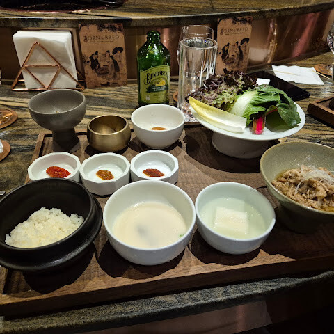 우리는 일찍 거기에 도착했고 그들이 우리를 우리 방으로 안내하기 전에 기다려야 했습니다. 우리는 맛있는 저녁 식사와 함께 레드 와인 한 병을 주문했습니다. 그리고 강좌가 시작되었습니다. 그들은 우리에게 다양한 쇠고기 부위를 제공했고 모두 약간 다르게 요리했지만 모두 매우 맛있고 딱 알맞게 요리되었습니다. 거의 다 됐다고 생각했을 때 미각 세정제를 주시고 비빔밥과 국 같은 쌀국수를 주셨습니다. 모든 코스는 너무 좋았고 밤이 끝날 무렵에는 우리가 매우 꽉 찼습니다.