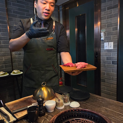 3층에서 점심 식사를 위해 두 사람용 개인실을 예약했습니다. 다윈 셰프가 완벽하게 조리한 다양한 한우 부위를 맛보며 즐거운 시간을 보냈는데, 셰프는 대화도 잘 통했습니다.