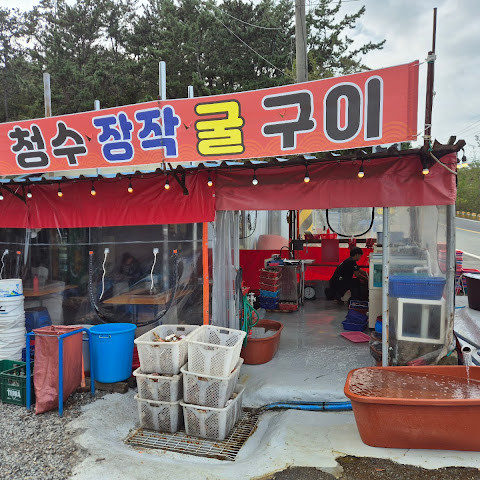 바닷가 앞에 있는 청수굴구이는 굴 철에 오면 대기표를 받아야 할 정도로 사람들이 많이 찾는 맛집이다. 포장마차의 외관은 본관이고 옆에 개별 룸이 있는 별관이 있다. 순서에 따라 두 곳 중 한 곳으로 안내를 받아 들어가면 된다. 화로와 연결된 굴뚝이 있는 자리에는 큰 찜기와 장작이 함께 준비된다. 테이블마다 찜기가 있어 주문 후 직원이 굴과 가리비를 넣어 뚜껑을 닫고 가는데 직원이 열어 줄 때까지는 절대 열지 말아야 한다. 약 15분 정도 있다 뚜껑을 열어주면 장갑과 칼을 이용하며 껍데기를 열어 초장과 간장에 찍어 먹으면 된다. 굴을 다 먹고 후식으로 굴라면과 전복죽을 먹을 수 있다. 청수굴구이 근처 저도 연륙교도 있어 함께 방문하기 좋다.