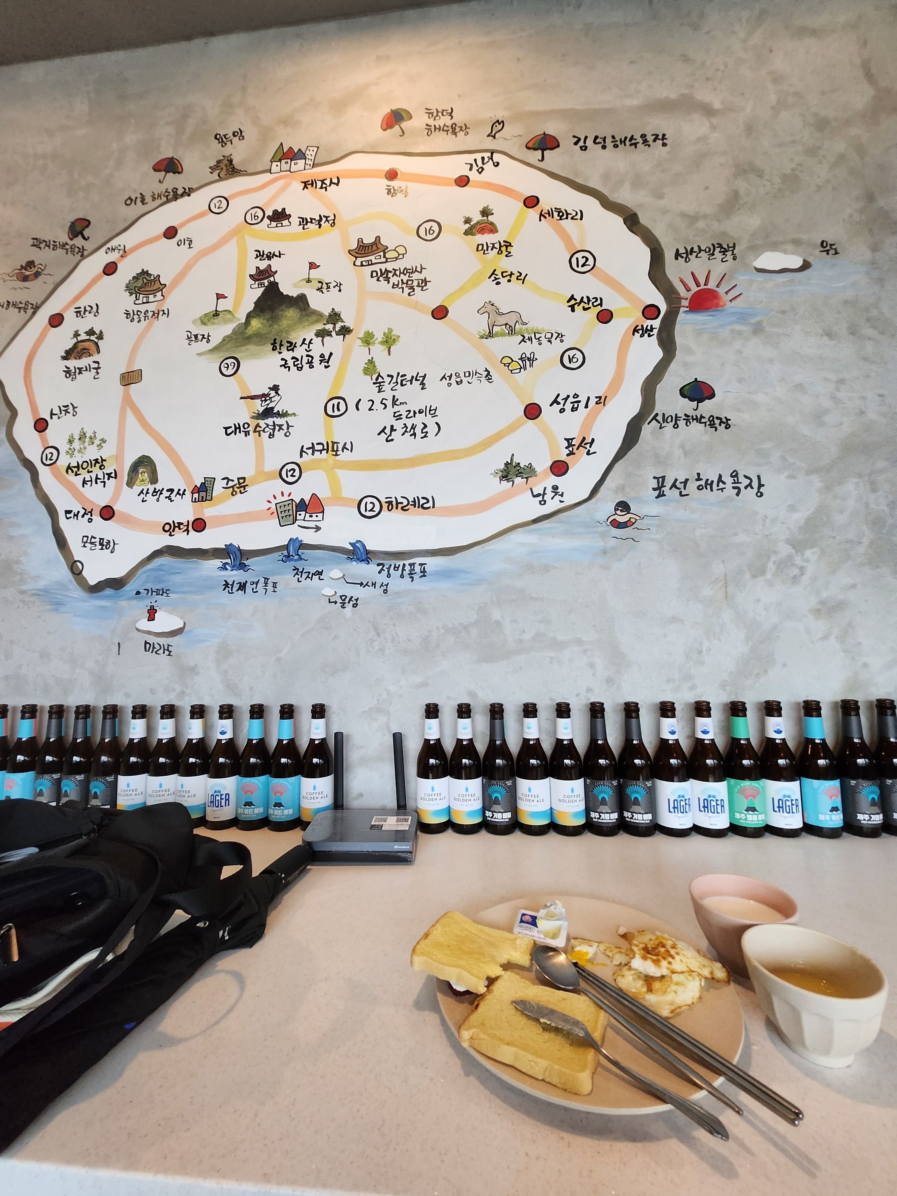 친절하게 한라산뷰가 있는 방으로 배정해주셔서 맑은 날 아침 창문넘어로 제주 한라산 실컷보며 힐링했습니다. 조식먹고 공용식사공간이 있어서 편했습니다, 공용주차장 가까워서 아예 공영주차장대고 들어가니 맘 편했어요