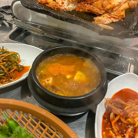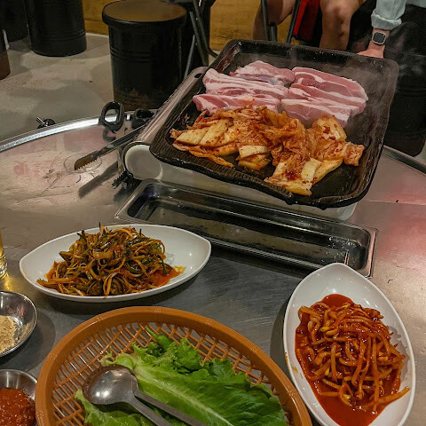 직원분이 직접 삼겹살을 구워주셨고, 한국식으로 먹는 법도 친절하게 알려주셨습니다. 삼겹살을 된장에 찍어 김치와 함께 상추에 싸서 먹는 방식이었는데, 처음 먹어봤지만 정말 환상적이었습니다. 삼겹살은 바삭하고 풍미가 좋았고, 된장은 고소하면서도 은은한 단맛이 더해져 느끼함을 잡아주었습니다. 김치는 새콤하고 매콤해서 완벽한 조화를 이루었습니다. 이렇게 맛있을 줄은 상상도 못 했습니다.