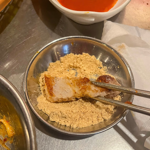 생삼겹살! 최고~ 지글지글 김치를 막 구워서 콩나물까지! 김치대박^^ 파무짐도 맛있어용!! 콩가루에 콕 찍어먹는 맛^^