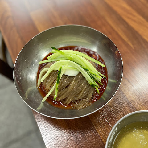 양평군 옥천면에 여러 냉면집이 있는데 그중에서는 여기가 만족도가 가장높았음 물냉면과 비빔냉면 편육 완자등의 메뉴가 있고 오늘은 편육에 물냉면을 먹었다 면은 두꺼우며 쫄깃한 식감 국물맛은 말로 형용되지 않는 무언가 만족감이 있어 면과 잘어울리며 중독성이 있다. 편육과 함께 먹으니 금상첨화