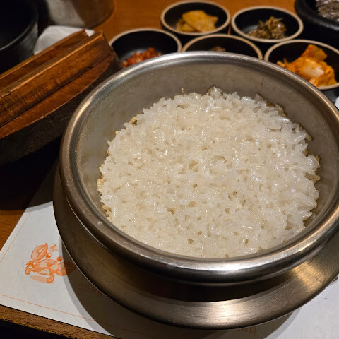 오픈 직후 바로 방문했는데, 리셉션 직원이 대기 시간이 한 시간 정도 걸릴 수 있다고 알려주더군요. 일정이 빠듯해서 신경 쓰지 않고 주변을 좀 걸어보기도 했습니다. 인터넷으로 게살 먹는 법을 찾아보니 다행히 직원분들이 자세히 설명해 주셔서 좋았습니다. 계란찜도 정말 맛있고, 따뜻한 냄비에 담긴 밥도 정말 맛있습니다. 밥알이 살짝 타는 냄새가 나는데, 그 향이 정말 끝내줍니다! 따뜻한 물을 부으면 맛있는 죽처럼 완성됩니다.