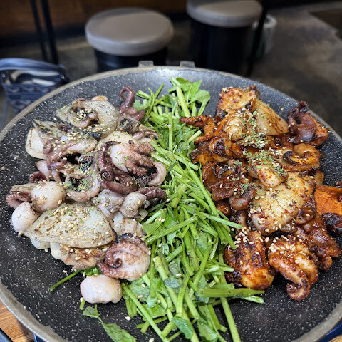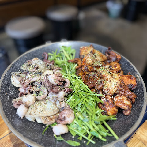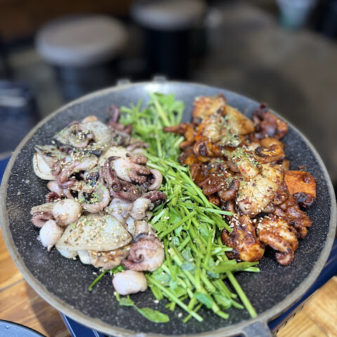 우리 가족이 제일 좋아하는 주꾸미집(작은 오징어 구이)인데 매콤하면서도 정말 맛있어요. 꼭 가보세요. 사람이 너무 많아서 오래 기다릴 각오해야 해요.