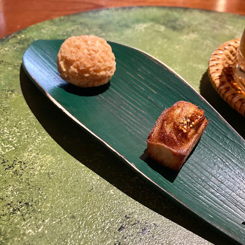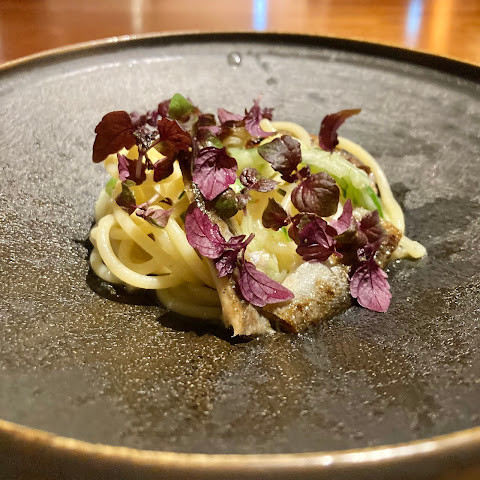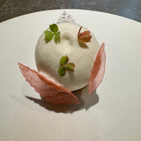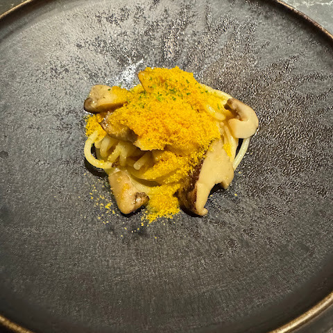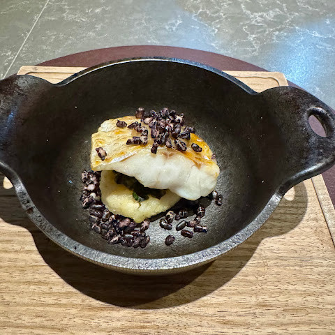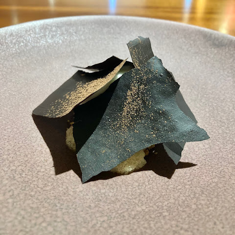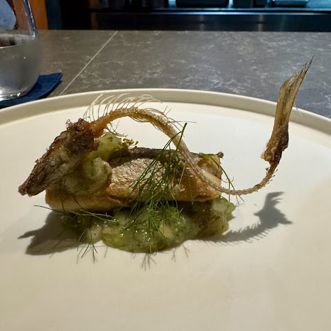 점심 분위기는 즐겁고 차분했고, 바에 앉아 셰프들이 요리하는 모습을 볼 수 있었습니다. 식기는 대부분 평범했고, 일부는 긁힌 자국이 많았습니다. 식기는 괜찮았지만 조금 지루했습니다. 9가지 코스 중 오랫동안 기억에 남을 만큼 만족스러운 코스는 단 하나뿐이었습니다. 저는 그 점이 아쉬웠습니다. 그렇게 많은 코스를 맛보았는데, 적어도 몇 가지는 감동받을 거라고 기대했습니다. 두 가지 요리는 식기나 토핑 선택 때문에 먹기가 어려웠습니다. 또한, 코스는 위험하지만 재미있는 기법과 구성을 실험하는 부분이 없어서 안전했습니다.