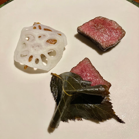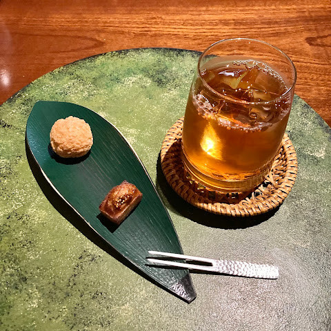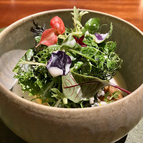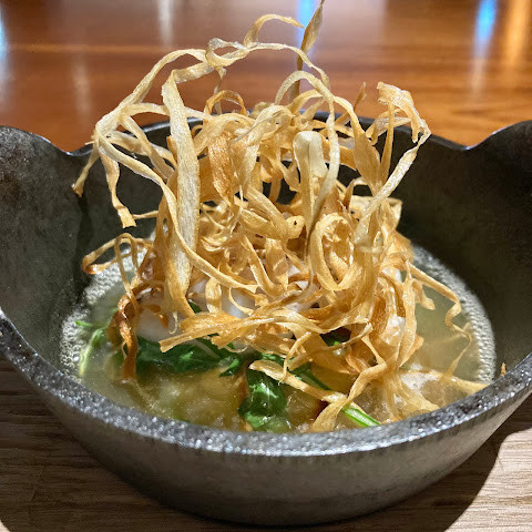 말머리는 살짝 익었지만, 익힘 정도도 완벽했어요. 산초 소스를 살짝 뿌려 짭짤하고 얼얼한 맛을 더해 독특한 풍미를 더했어요. 육수와 튀긴 우엉의 향이 어우러져 전체적인 조합이 꽤 좋았어요.