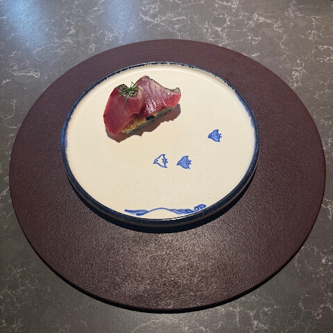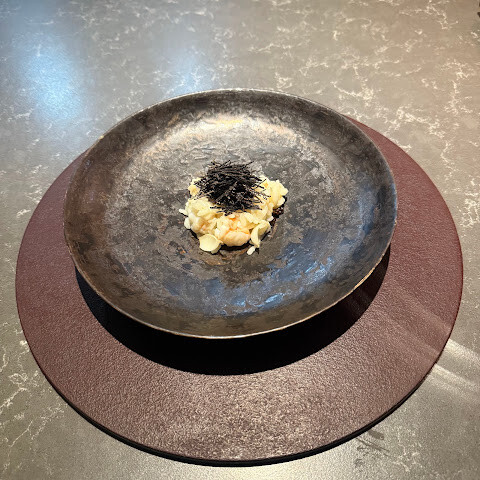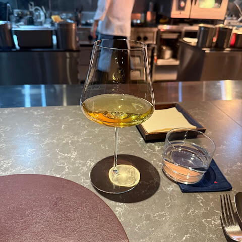 점심 분위기는 즐겁고 차분했고, 바에 앉아 셰프들이 요리하는 모습을 볼 수 있었습니다. 식기는 대부분 평범했고, 일부는 긁힌 자국이 많았습니다. 식기는 괜찮았지만 조금 지루했습니다. 9가지 코스 중 오랫동안 기억에 남을 만큼 만족스러운 코스는 단 하나뿐이었습니다. 저는 그 점이 아쉬웠습니다. 그렇게 많은 코스를 맛보았는데, 적어도 몇 가지는 감동받을 거라고 기대했습니다. 두 가지 요리는 식기나 토핑 선택 때문에 먹기가 어려웠습니다. 또한, 코스는 위험하지만 재미있는 기법과 구성을 실험하는 부분이 없어서 안전했습니다.