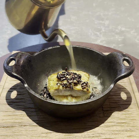 말머리는 살짝 익었지만, 익힘 정도도 완벽했어요. 산초 소스를 살짝 뿌려 짭짤하고 얼얼한 맛을 더해 독특한 풍미를 더했어요. 육수와 튀긴 우엉의 향이 어우러져 전체적인 조합이 꽤 좋았어요.