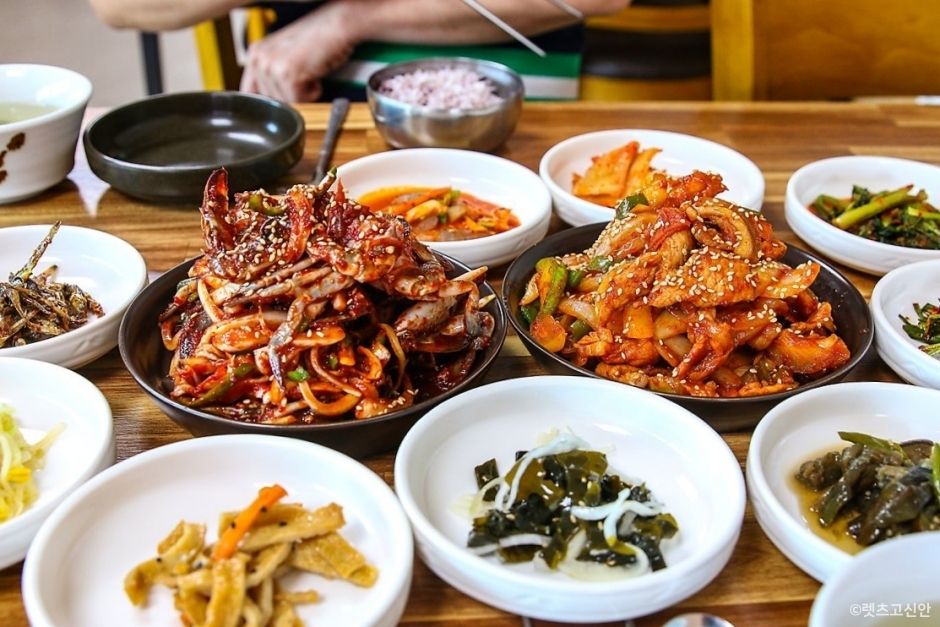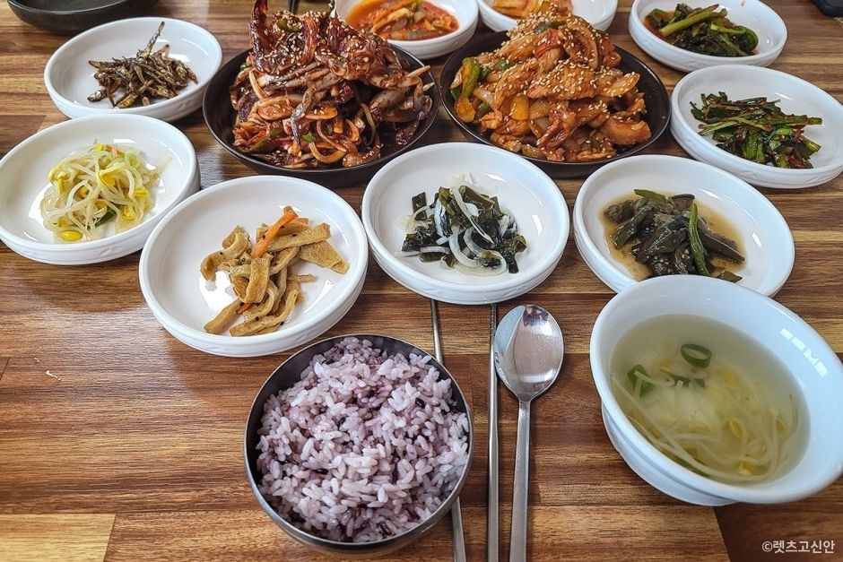 신안군 증도의 갯마을식당은 꽃게무침으로 입소문 난 집이다. 얼마 전 노후한 외관을 리모델링하여 깨끗한 인테리어에 만족하고, 친절해서 한 번 더 만족하는 곳이다. 반찬은 모두 갯마을식당에서 직접 만든다. 민물 새우장, 미역 초무침, 김치와 함께 달콤한 양파와 깨소금으로 무친 꽃게무침은 양념 꽃게장하고는 차원이 다른 맛이다. 꽃게가 네 마리 정도 들어있고 한입에 먹기 좋은 사이즈다. 별미 반찬인 민물 새우장 무침은 삼삼하니, 밥과 함께 비벼 먹으면 맛이 두 배가 된다. 근처 신안해저유물 발굴 기념비가 있는 솔무등공원과 짱뚱어다리를 걸어보는 것도 추천한다.