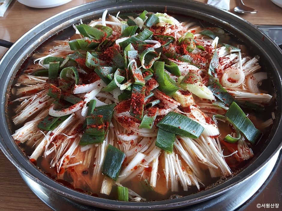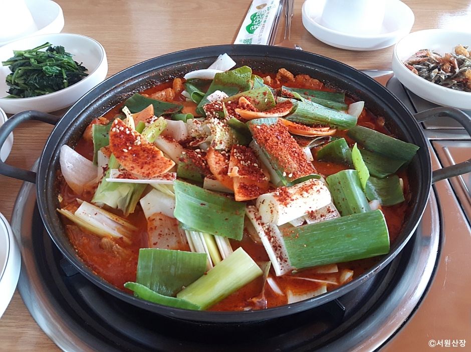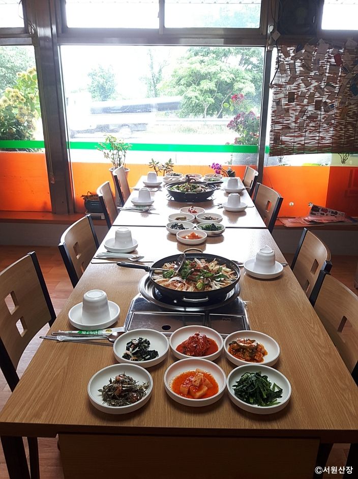서원산장은 강원도 횡성군에 있는 두부 전문점이다. 모두부, 두부전골, 순두부, 돼지고기 짜글이 맛집이다. 조금만 늦게 가도 모두부는 맛볼 수 없다. 양념도 간단하게 새우와 바지락을 끓이는 전골인데 시원한 국물에 두부 맛이 고소하다. 어떤 음식을 시키든지 차려지는 밑반찬은 김치, 깍두기, 나물 3~4가지이다. 두부, 반찬도 모두 국내산 재료를 사용해서 주인이 직접 만드는 반찬들이다. 셀프바에 있는 음식을 추가로 먹을 수 있다. 돼지고기를 넣어 자글자글 끓여 먹는 짜글이도 맛이 좋아 인기가 좋다. 주변에 골프장이 많아 라운딩을 끝낸 골퍼들이나 지역 주민들이 많이 찾는 식당이다.