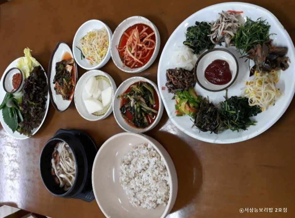 서삼능보리밥은 고양시 덕양구 흥도로에 있는 보리밥 전문점이다. 단독건물인 이곳은 가게 앞에 넓은 주차장이 있어 편하게 주차할 수 있다. 넓고 깔끔한 매장에는 테이블이 많고 여유롭게 배치되어 있다. 이 식당은 보리밥에 10가지 나물과 고추장을 넣어 비벼 먹는 보리밥이 대표 메뉴이다. 추가 반찬과 쌈 채소는 셀프바에 준비되어 있어 편하게 이용하면 된다. 음식은 인원수에 맞게 주문해야 하며 남은 음식을 포장해갈 수 있는 셀프 포장대가 있다. 서삼능보리밥에서는 직접 재배한 무공해 채소를 매일 아침 수확하여 제공하고 있으며 전 메뉴 포장할 수 있다.
