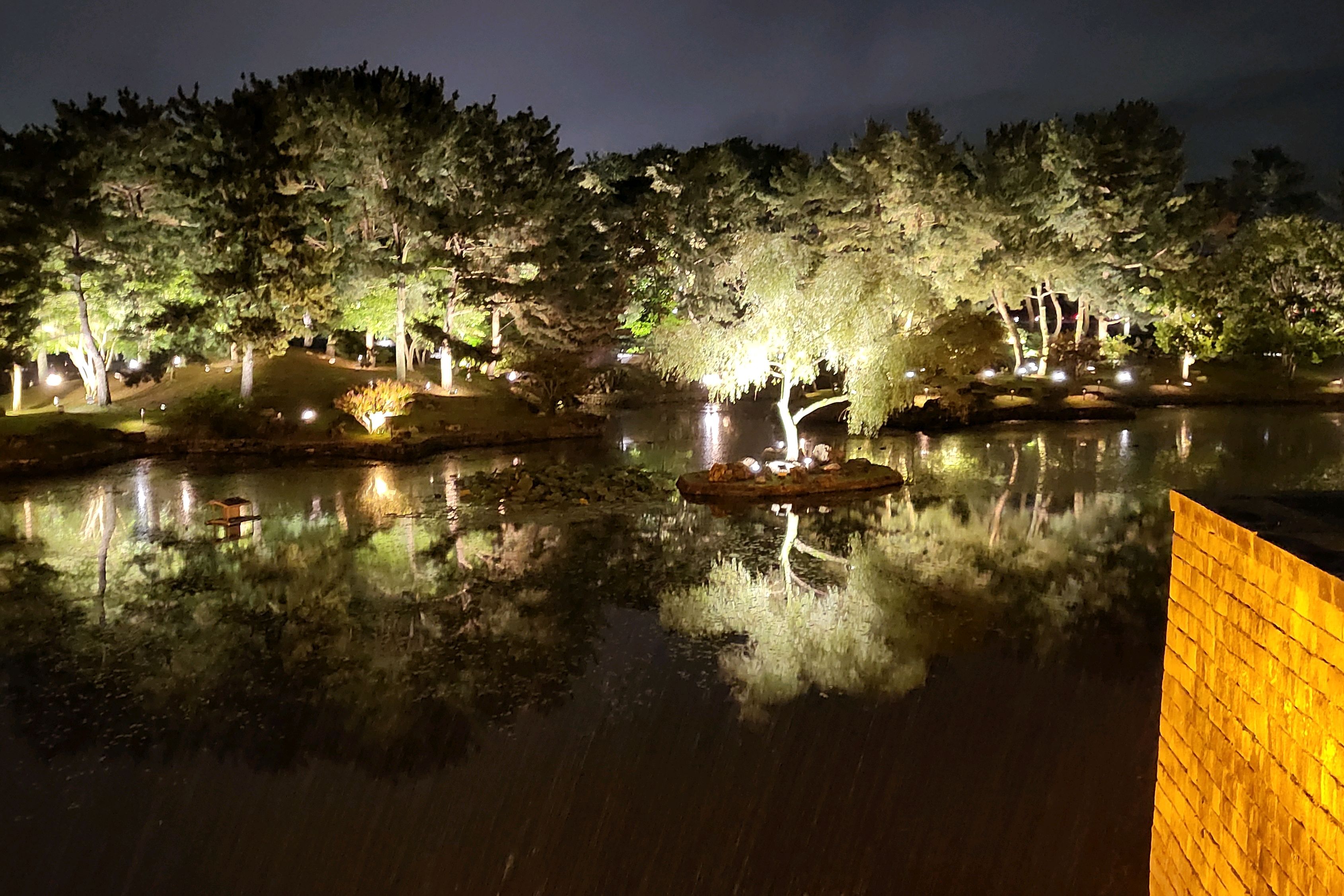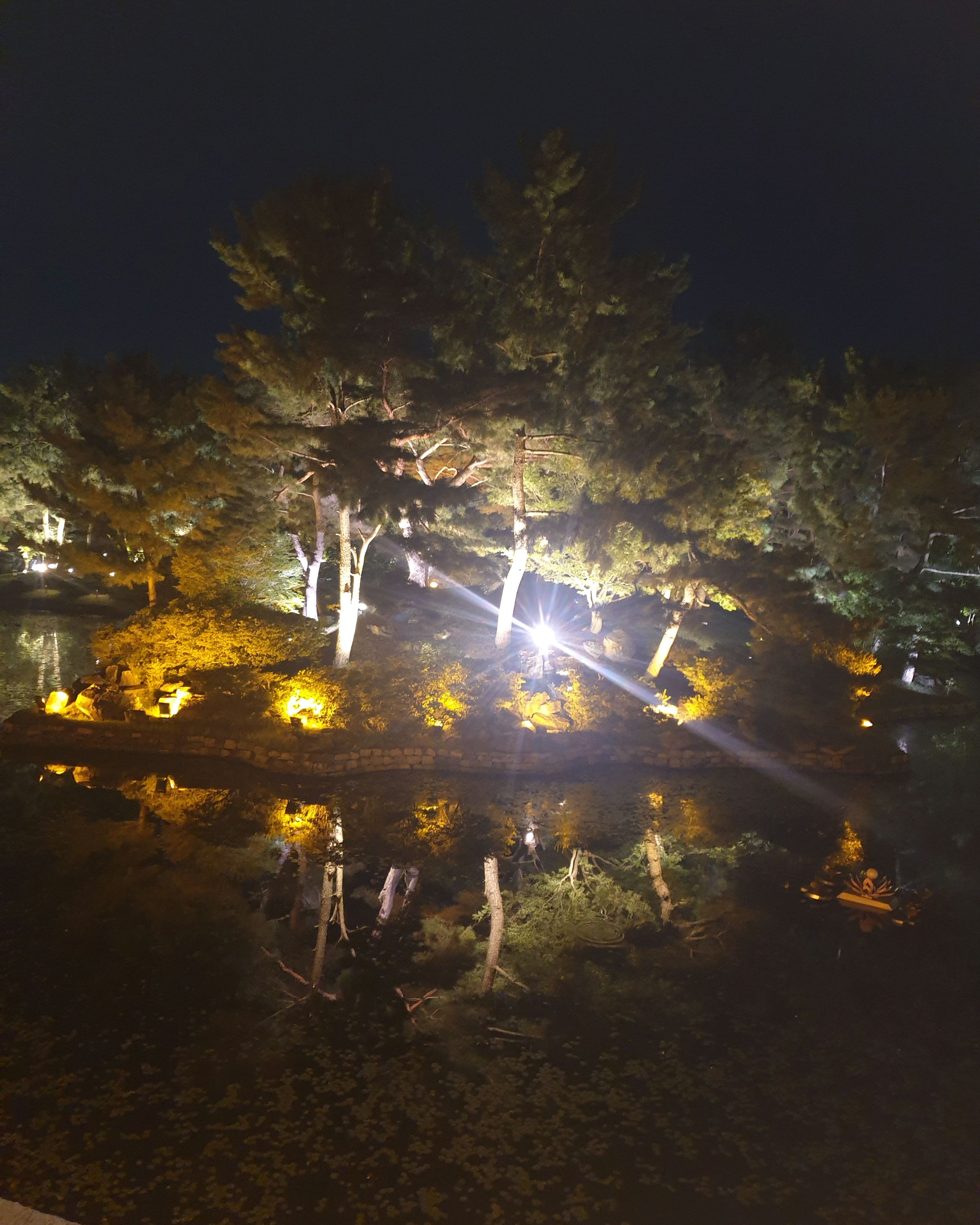 나무에까지 조명을 달아놔서 연못에 비친 반사된 경관이 장관임