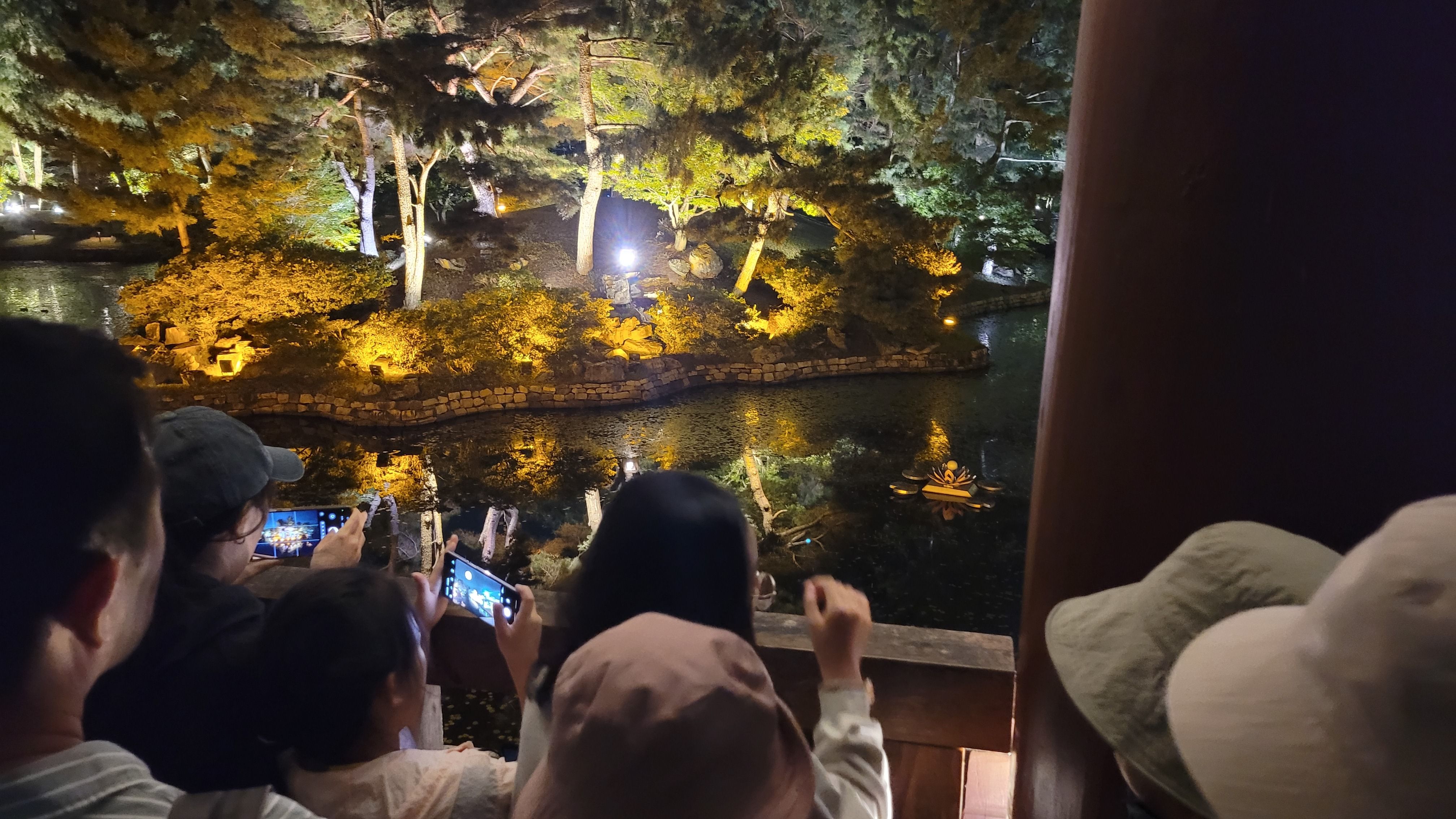 밤이 깊어질수록 사람들의 발걸음은 잦아들지 않습니다. 연못가를 거닐며 웃음 짓는 여행객들, 사진으로 그 찰나의 아름다움을 담으려는 이들의 손끝에서 가을의 감성이 전해집니다.