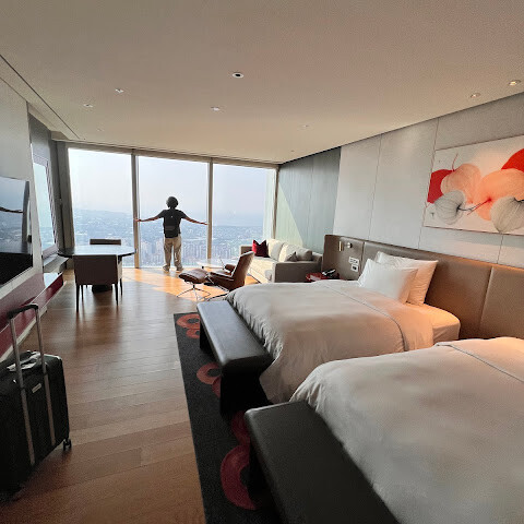 3박 4일 자유여행에 그랜드 하얏트 호텔에서 3박을 묵었습니다. 위치가 정말 좋았습니다(신라 면세점까지 걸어서 갈 수 있는 거리). 호텔에서 공항 및 시내 버스 셔틀을 운행해서 매우 편리했습니다. 저는 13층에 묵었는데, 객실은 넓고 편안했고 전망도 정말 좋았습니다.