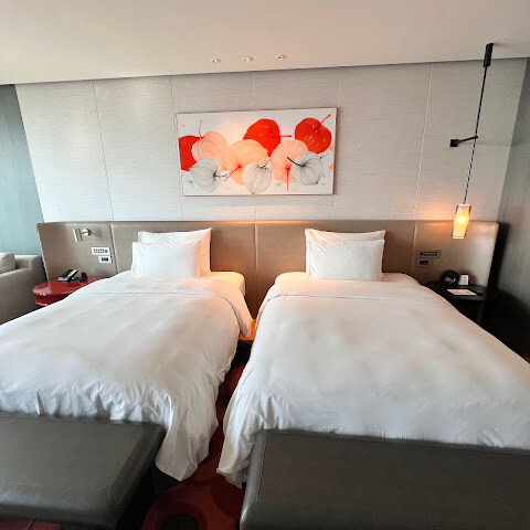 우선, 객실은 꽤 넓었고 더블 침대 두 개가 놓여 있었습니다. 욕실에는 샤워부스와 화장실이 분리되어 있었고, 전반적인 청결 상태와 관리가 훌륭했습니다. 숙박 시설은 기대했던 고급 호텔답게 만족스러웠습니다.