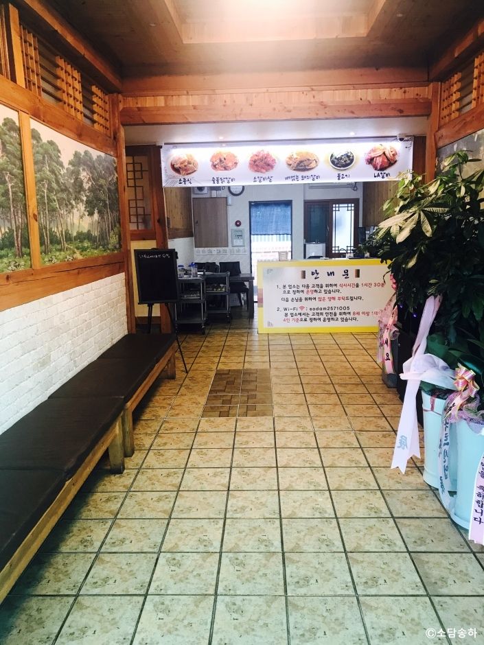 소담송하는 강원도 춘천시에 있는 고기구이 식당이다. 뼈 없는 돼지갈비나 소갈빗살, 닭갈비 등을 합리적인 가격에 팔고 있어 고객들이 많이 방문하는 식당이다. 고기는 숯불에 구워 먹는다. 곁들임 반찬은 파채, 양파절임, 묵김치말이, 상추, 마늘 정도이다. 곁들임이 화려하지는 않지만, 고기를 구워 먹을 때 꼭 필요한 반찬들이다. 고기를 먹고 난 후에는 비빔냉면, 물냉면 등으로 시원하게 입가심을 할 수 있다. 춘천에서 닭갈비가 아닌 음식을 먹고 싶다면 방문할 만하다. 회식이나 가성비 좋은 음식을 찾을 때 방문하면 좋은 식당이다. 주차는 매장 앞에 큰 주차장이 있어서 편하게 이용할 수 있다.