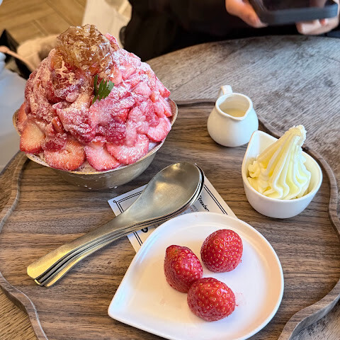 소셜 미디어에서 이 카페를 많이 봤어요. 오픈 15분 전부터 줄을 섰는데, 이미 앞에 짧은 줄이 있었어요. 케이크와 빙수는 저렴하지는 않지만, 과일이 듬뿍 들어있어서 괜찮았어요. 첫 방문으로는 괜찮았지만, 아마 다시 갈 것 같지는 않네요.