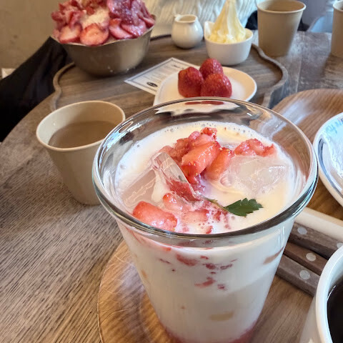 딸기 빙수랑 딸기 두바이 초콜릿 크레페 케이크, 아메리카노, 딸기 라떼를 주문했어요. 딸기가 정말 크고 자연적으로 달콤했어요! 디저트도 단맛이 딱 적당했어요. 최고였어요. 다만, 개인적인 취향이긴 하지만 한정선에서 먹었던 데카당트 두바이 초콜릿이 더 맛있었어요.