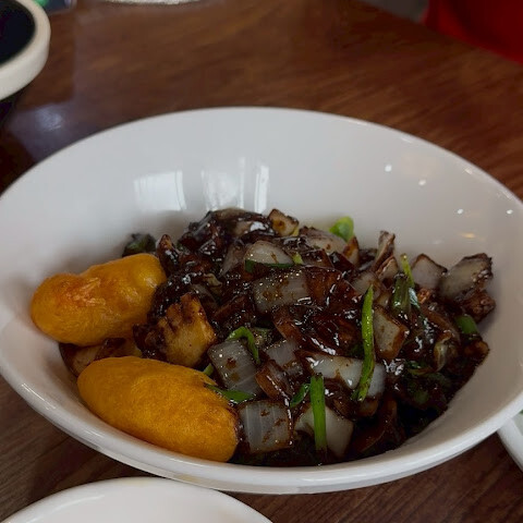 저는 단체 관광객으로 왔어요. 된장면은 꽤 맛있었고, 모두에게 탕수육이 한 조각씩 나왔어요.